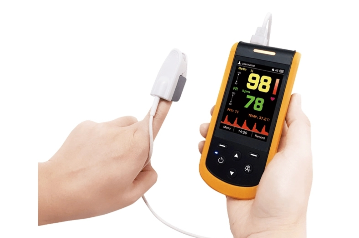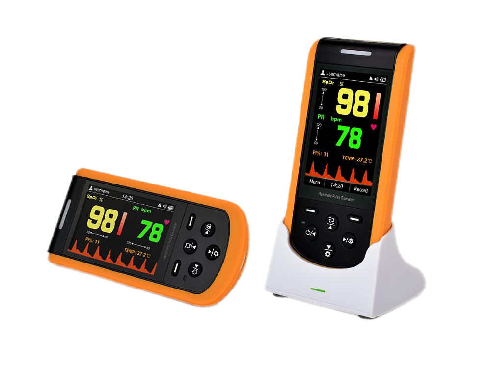 • 3,5” automatiškai besisukantis TFT ekranas, kuriame rodomi SpO2, PI, bangos forma, PR